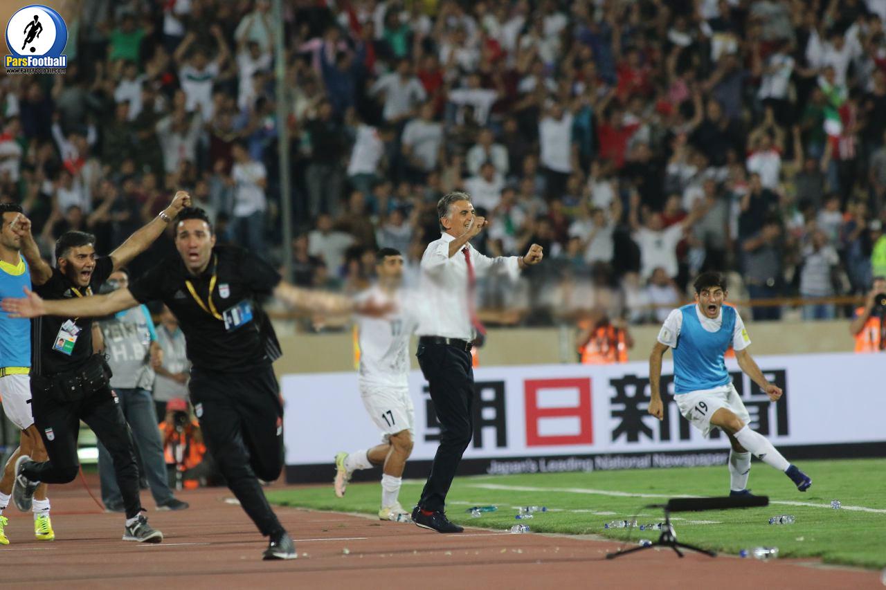 بعد از گل دوم ایران ، کی روش از خوشحالی به آسمان پرید و بازیکنان او را در آغوش گرفتند که ناگهان سرمربی تیم ملی زمین خورد و اشکان دژاگه به روی افتاد که باعث خنده دیگر بازیکنان شده بود.
