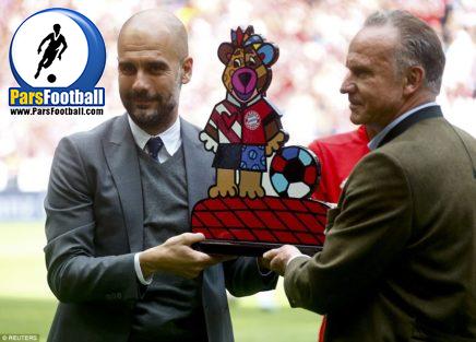 گواردیولا که در تابستان راهی منچسترسیتی می شود، در دیدار امروز مقابل هانوفر برای آخرین بار در یک دیدار خانگی هدایت بایرن را برعهده داشت. مدیران این باشگاه هم از این فرصت استفاده کردند و هدیه ای که نماد باشگاه بایرن و ماکتی از ورزشگاه آلیانس آره نا بود را به او اهدا کردند. او تنها یک بار دیگر و در دیدار فینال جام حذفی مقابل بروسیا دورتموند بایرنی ها را هدایت خواهد کرد.