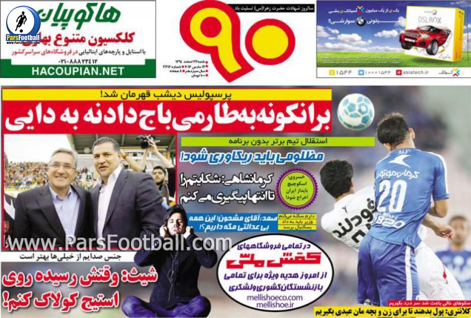 روزنامه نود ، پنجشنبه ۱۹ اسفند ؛ موضع هواداران استقلال علیه برانکو