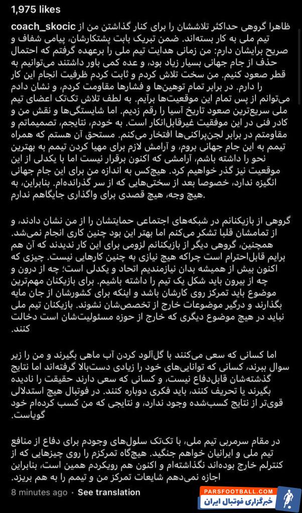پیام دراگان اسکوچیچ را که در صفحه شخصی اینستاگرامی اش منتشر شده می خوانید: