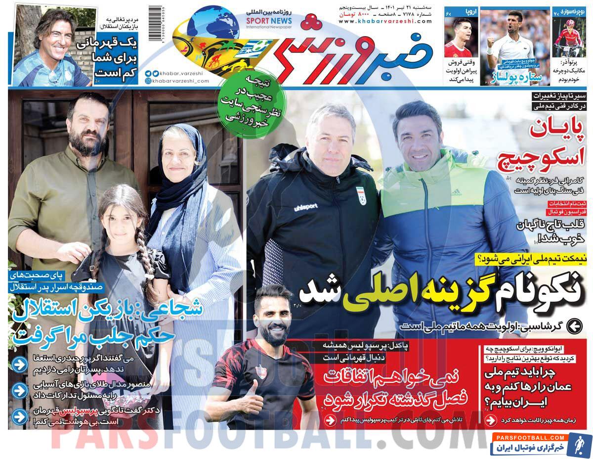 مرور عناوین مهم روزنامه خبر ورزشی سه شنبه 21 تیر ماه سال 1401