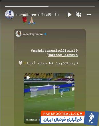 در ادامه مهدی طارمی هم با بازنشر استوری میلاد کی مرام بازیگر سینما به نوعی پاسخ آزمون را داد. ویدیویی که صحنه پاس گل آزمون به طارمی در دیدار مقابل امارات است و عنوان «ترسناکترین خط حمله آسیا» برای این ویدیو انتخاب شده است.