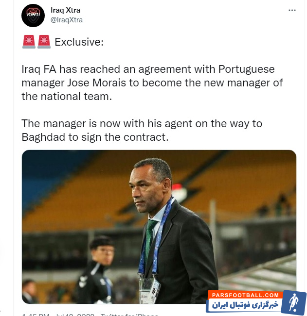 فدراسیون فوتبال عراق با ژوزه مورایس، سرمربی پرتغالی برای سرمربیگری تیم ملی عراق به توافق رسیده است! این سرمربی پرتغالی به همراه ایجنت خود در راه بغداد برای امضای قرارداد می باشد.