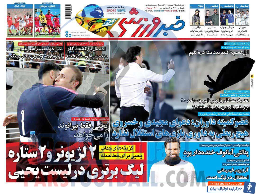 عناوین روزنامه خبر ورزشی پنجشنبه ۲۵ فروردین ماه به شرح زیر است :