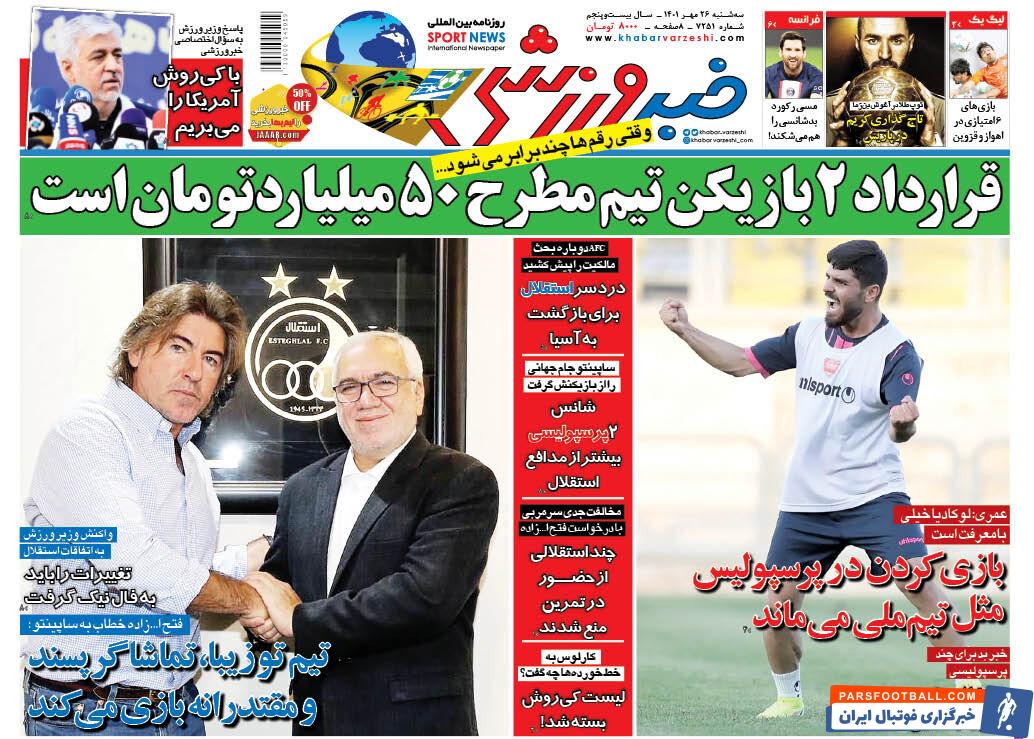 مرور عناوین مهم روزنامه خبر ورزشی سه شنبه 26 مهر ماه سال 1401