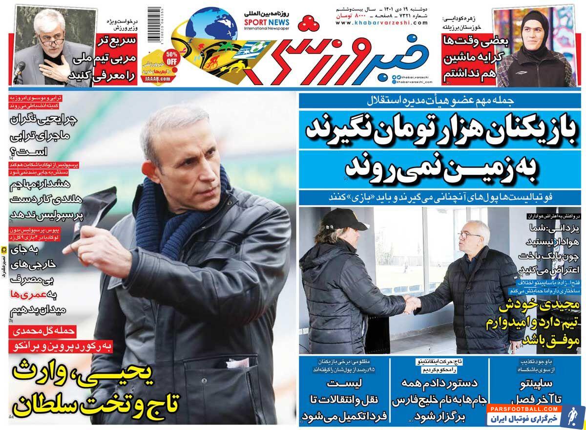 عناوین روزنامه خبر ورزشی دوشنبه ۱۹ دی ماه به شرح زیر است :