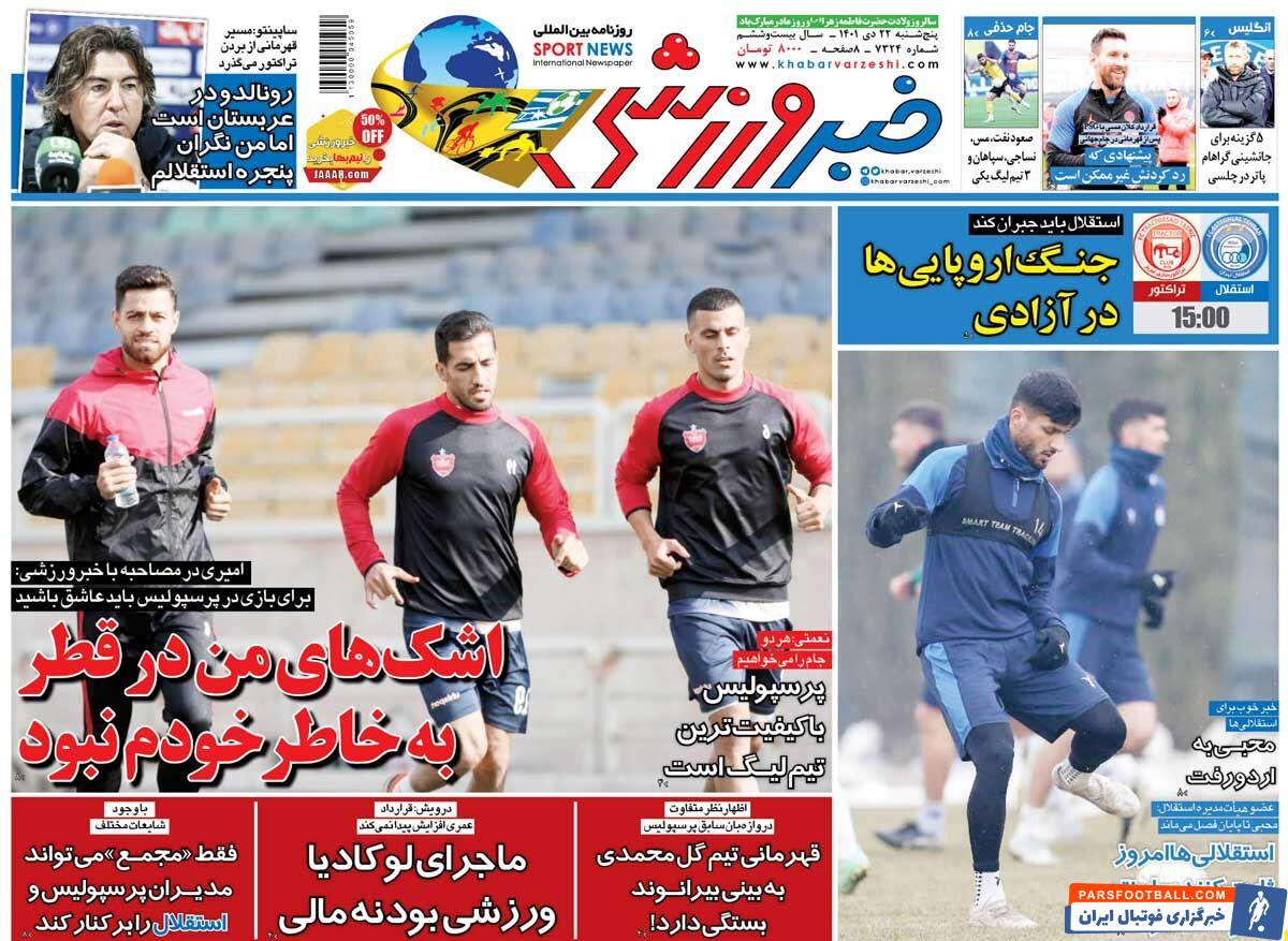 عناوین روزنامه خبر ورزشی پنجشنبه ۲۲ دی ماه به شرح زیر است :