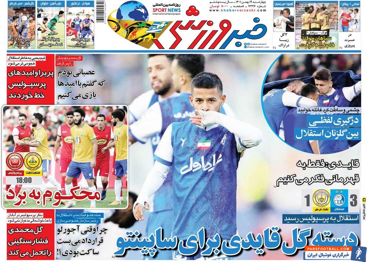 عناوین روزنامه خبر ورزشی چهارشنبه ۱۹ بهمن ماه به شرح زیر است :