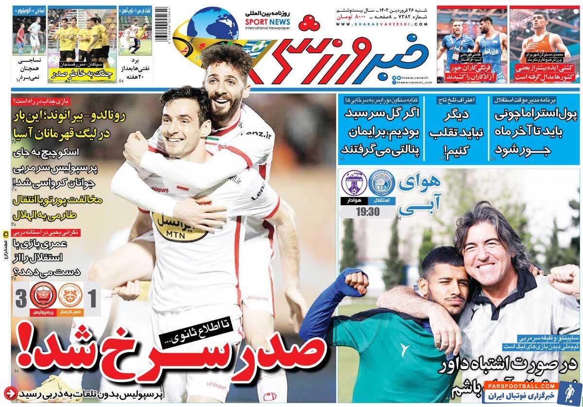 عناوین روزنامه خبر ورزشی شنبه ۲۶ فروردین ماه به شرح زیر است :