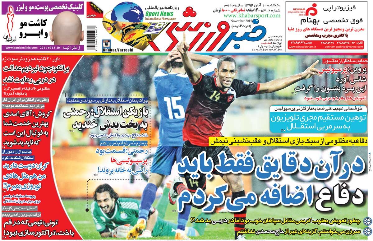 عکس جلد روزنامه خبرورزشی در تاریخ ۱۰ آبان ۱۳۹۴ را ملاحظه میکنید.