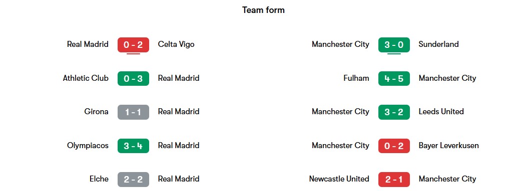 فرم رئال مادرید و منچسترسیتی در ۵ بازی گذشته