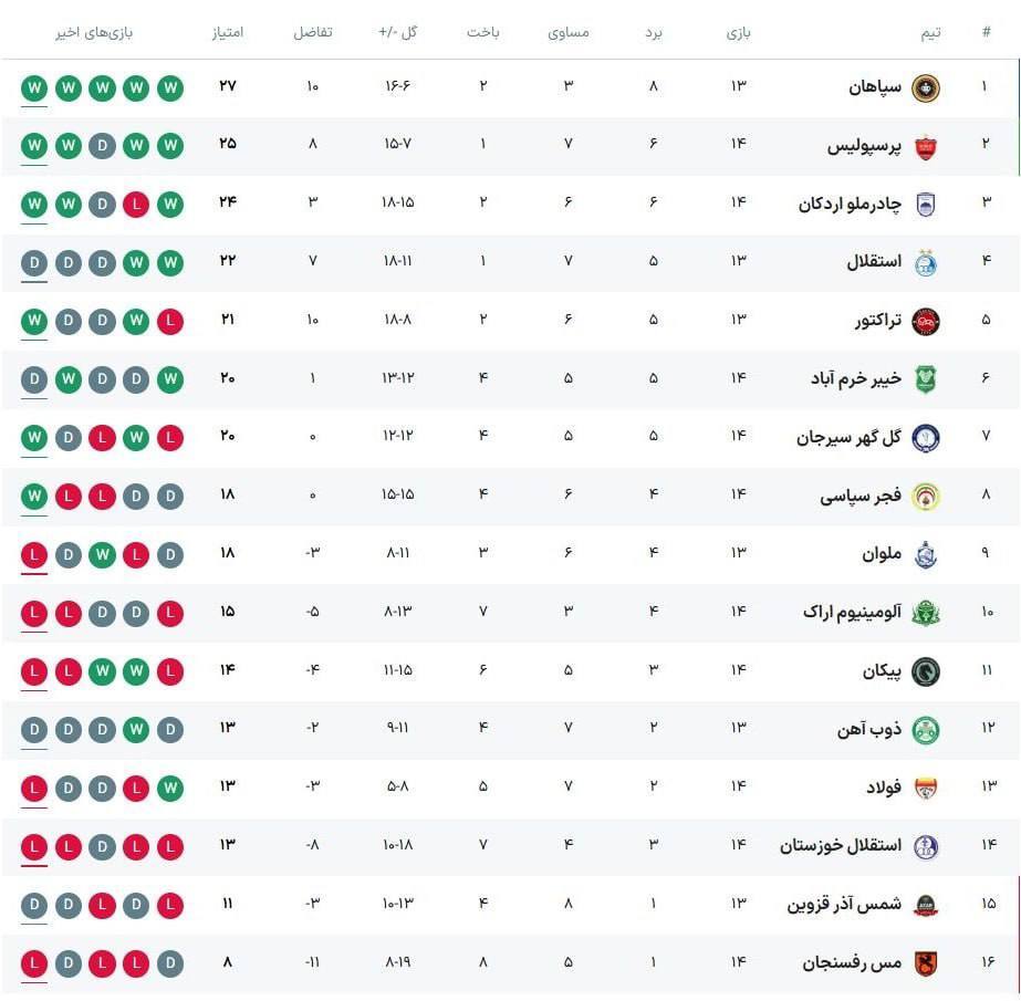 جدول لیگ برتر فوتبال در روز دوم از هفته چهاردهم