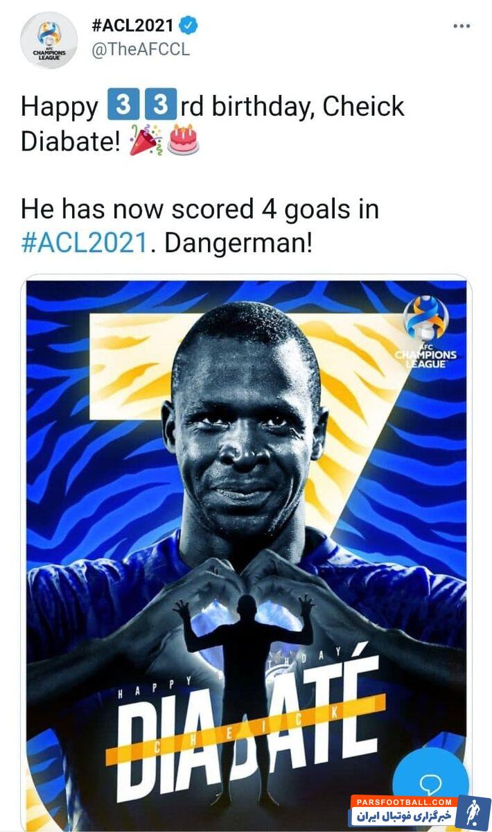 صفحه رسمی AFC در توئیتر با انتشار تصویری از شیخ دیاباته مهاجم گلزن استقلال ایران، تولد او را تبریک گفت و در تمجید از او، مهاجمی خطرناک توصیفش کرد.