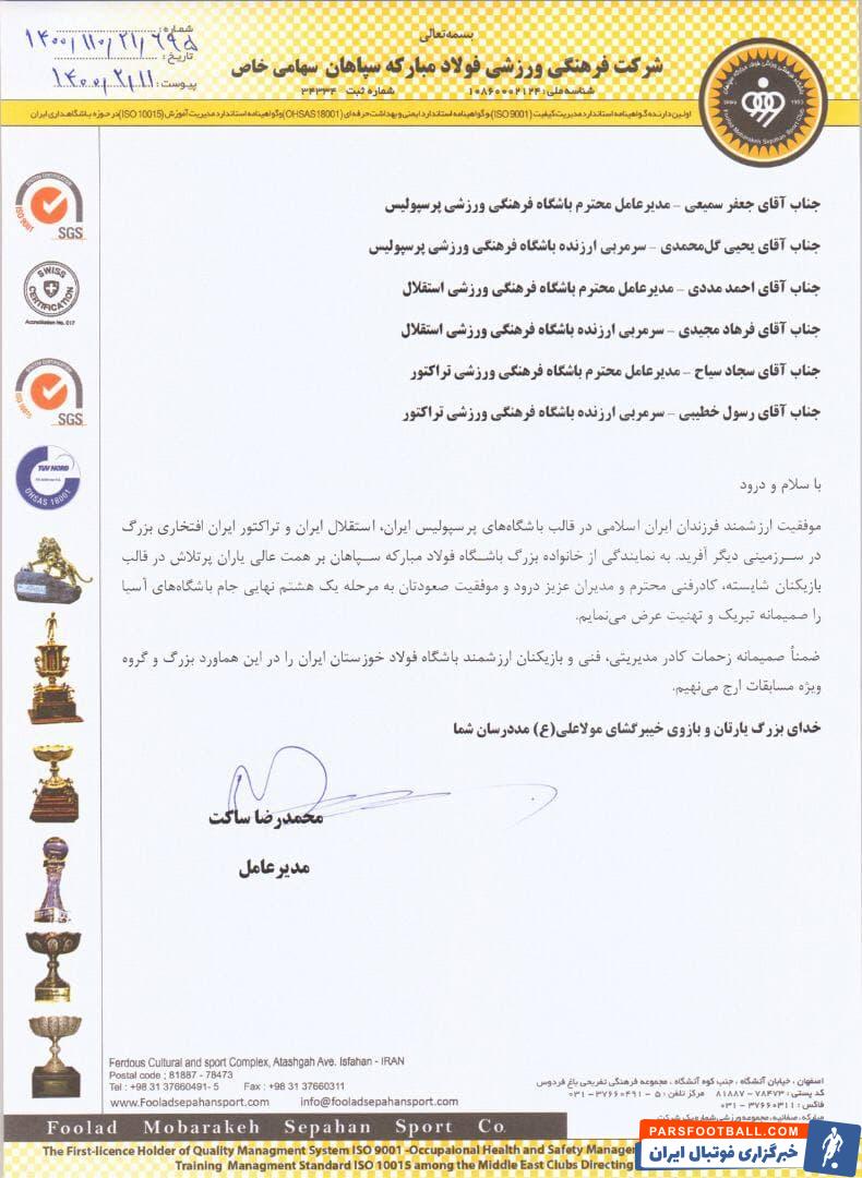 محمدرضا ساکت ، مدیرعامل باشگاه سپاهان ، با ارسال نامهای به باشگاههای پرسپولیس، استقلال و تراکتور، موفقیت این تیمها در لیگ قهرمانان و راهیابی به جمع ۱۶ تیم برتر آسیا را تبریک گفت.