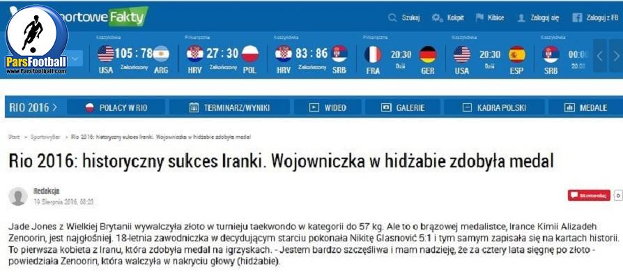 این سایت لهستانی در ادامه خبرش نوشته است: در وزن  ۵۷- کیلوگرم یونس انگلیسی مدال طلا را به‌دست آورد، اما مدال برنز کیمیا علیزاده سر و صدای زیادی را ایجاد کرد. او در بازی سرنوشت‌ساز توانست حریف خود را نتیجه ۵ بر یک شکست دهد و اولین بانوی ایرانی شود که در تاریخ المپیک به مدال دست پیدا می‌کند.