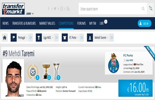 سایت معتبر ترانسفر مارکت ارزش مهدی طارمی را ۱۶ میلیون دلار تخمین زده است.