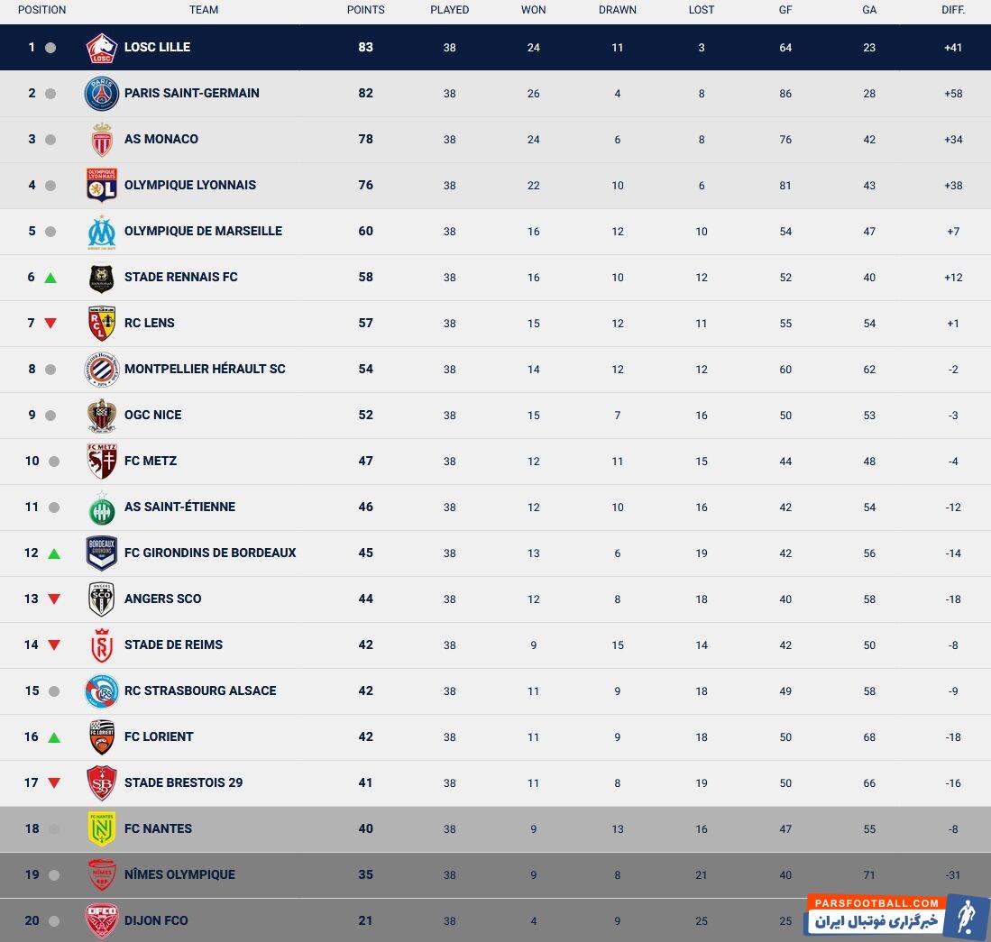 لیل با عبور از سد آنژه بالاتر از پاریسنژرمن قهرمان لیگ یک فرانسه شد، موناکو هم با قرار گرفتن در رده سوم دیگر سهمیه اروپا را گرفت.