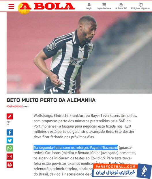 روزنامه آبولا پرتغال : پیام نیازمند در تمرینات پورتیموننزه حاضر شده است