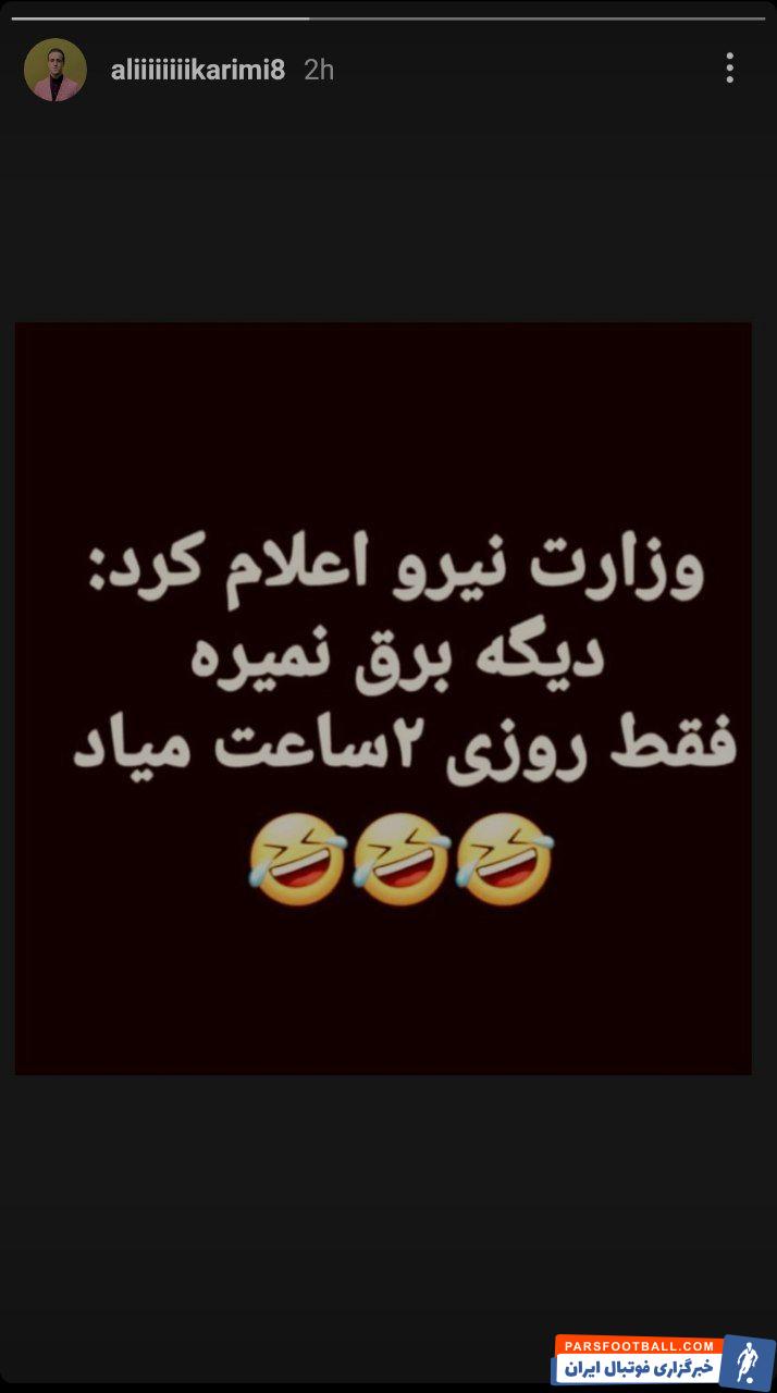 به گزارش طرفداری، قطعی مکرر برق در تهران با واکنش علی کریمی رو به رو شد. بازیکن سابق تیم ملی ایران و پرسپولیس با انتشار استوری زیر واکش جالبی به قطعی برق داشت.