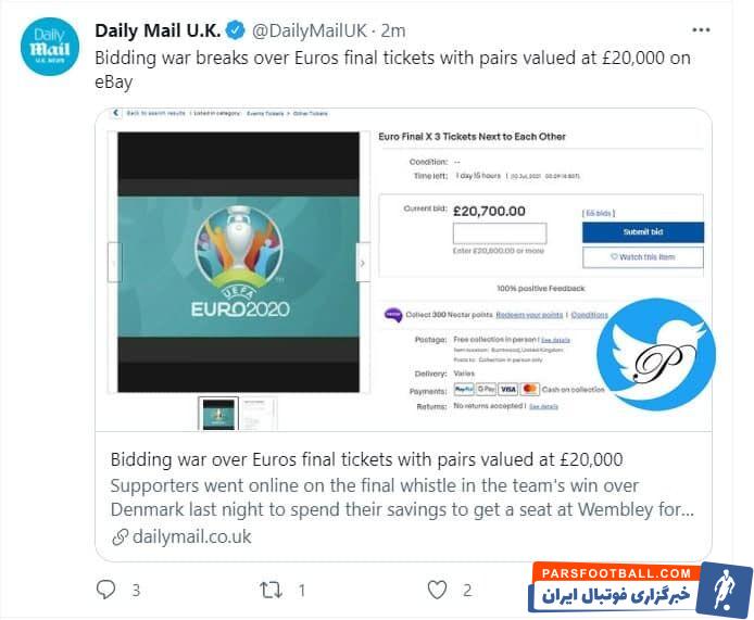 در سایت فروش آنلاین eBay یکی از بلیتهای دیدار فینال یورو ۲۰۲۰ بین انگلیس و ایتالیا با مبلغی هنگفت برای فروش قرار داده شده است.