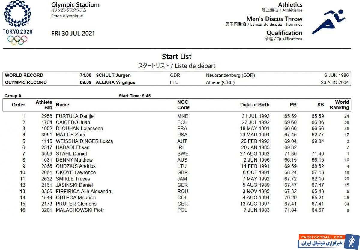هشتمین روز از بازیهای المپیک ۲۰۲۰ توکیو در حالی فردا (جمعه) پیگیری خواهد شد که دو ملیپوش دوومیدانی ایران باید تلاش خود برای حضور در فینال را آغاز کنند. در ماده پرتاب دیسک مردان، احسان حدادی کار خود را از ساعت ۵:۱۵ به وقت تهران و در گروه A آغاز خواهد کرد. دانیل استال از سوئد نفر اول رنکینگ جهانی، آندریوس گادزیدیس نفر ۴ رنکینگ دنیا از لیتوانی، پیوتر مالاچوفسکی از لهستان، لوکاس ویسهادینگر از اتریش از جمله مهمترین رقبای حدادی در این گروه هستند.