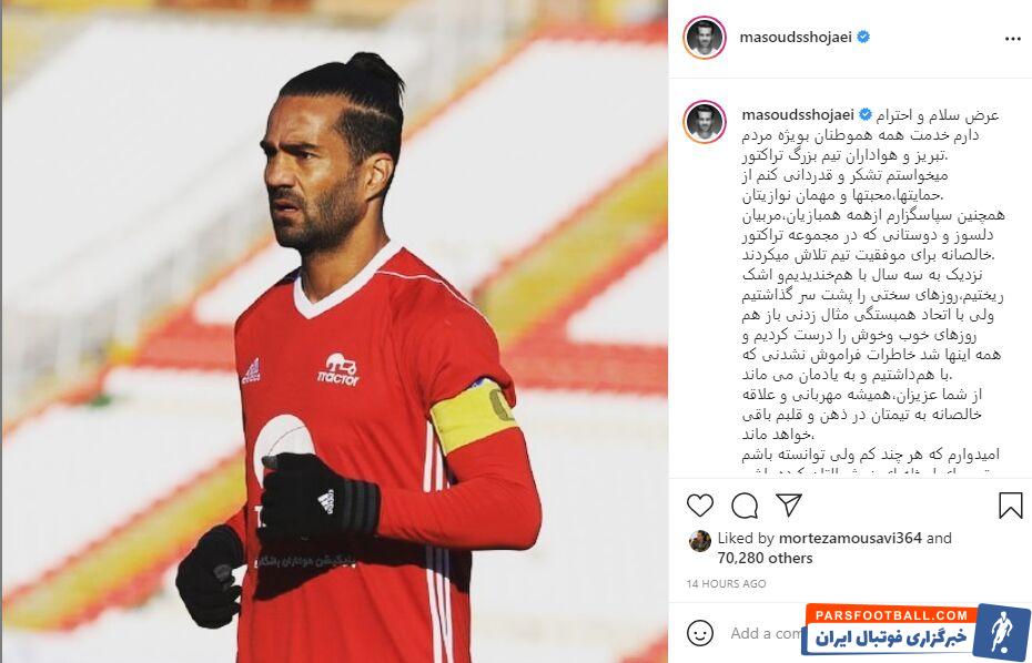 مسعود شجاعی کاپیتان سابق تراکتور یک پست اینستاگرامی خطاب به هواداران تراکتور در صفحه شخصیاش منتشر کرد.