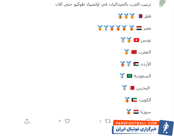 با نگاه به آمار مدال آوری کشورهای عربی در المپیک توکیو، قطر بهترین جایگاه را دارد ولی هیچ کدام با وجود هزینه های نجومی به اندازه کشورمان کسب مدال نکردند.