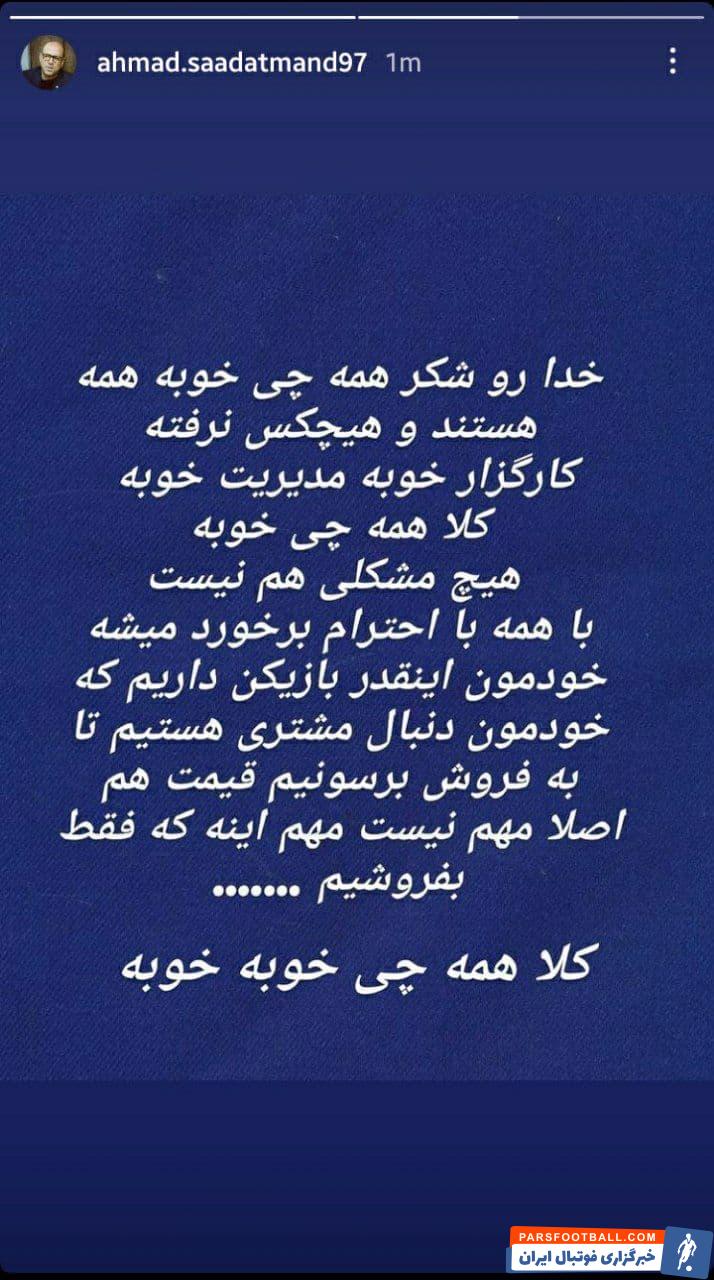 احمد سعادتمند که مدیرعامل پیشین باشسگاه استقلال است، استوری را منتشر کده است که انگار مضمون آن درباره احمد مددی است.