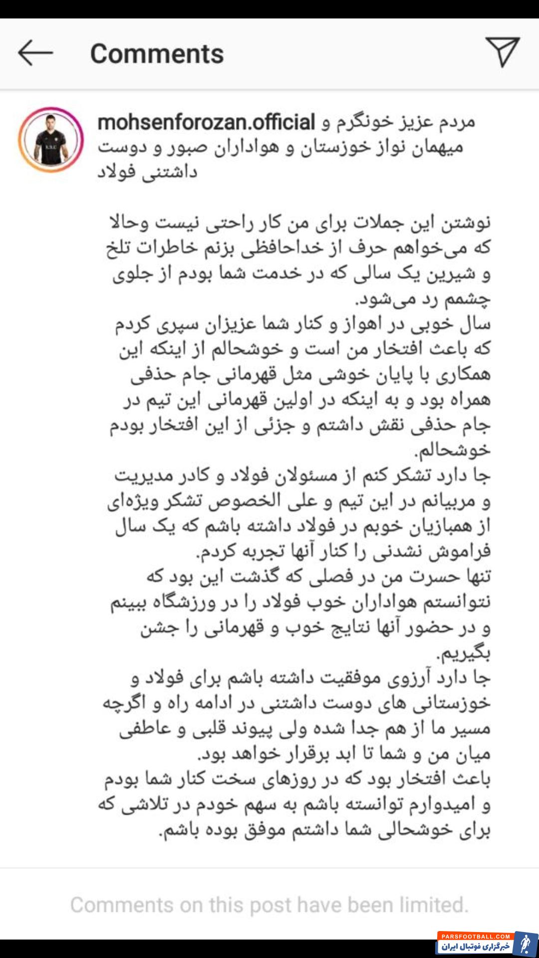 محسن فروزان با انتشار یک پست اینستاگرامی از هواداران فولاد خداحافظی کرد.