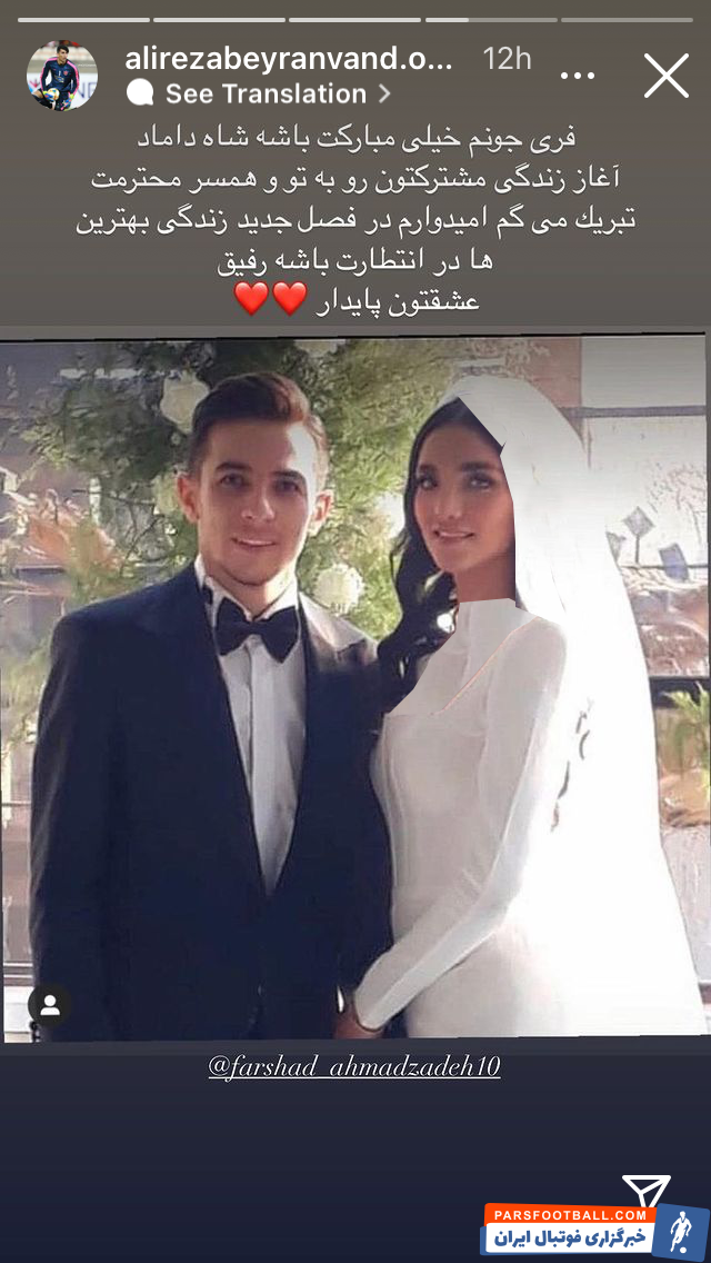 فرشاد احمدزاده بازیکن تیم فوتبال فولاد خوزستان آخر هفته گذشته ازدواج کرد و علیرضا بیرانوند برای او استوری تبریک گذاشت.‌‌‌‌‌‌‌‌‌‌‌‌‌‌