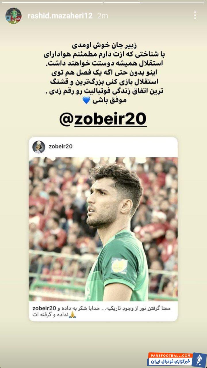 رشید مظاهری سنگربان استقلال پس از ثبت قرارداد زبیر نیکنفس با آبیها در اینستاگرام پیامی دلگرم کننده برای او به اشتراک گذاشت و انتخاب استقلال را بهترین اتفاق زندگی هافبک پیشین فولاد نامید.