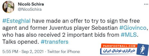طبق توئیت نیکو شیرا، استقلال به بازیکن سابق الهلال که در حال حاضر بازیکن آزاد محسوب میشود، پیشنهاد داده البته استقلال تنها مشتری سباستین جووینکو مهاجم ایتالیایی محسوب نمیشود و او از لیگ امریکا هم دو پیشنهاد جدی دارد.