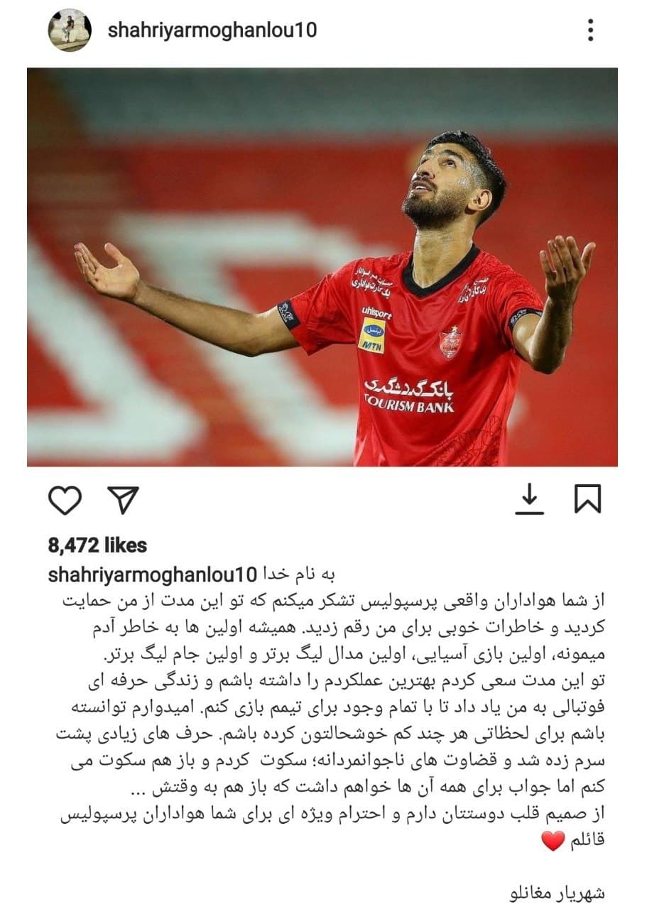 شهریار مغانلو در پستی اینستاگرامی از هواداران پرسپولیس تشکر کرد.