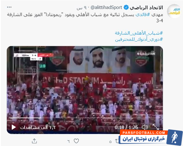 نشریه الاتحاد امارات : مهدی قایدی دو گل برای شباب الاهلی به ثمر رساند ریمونتادای تیمش را مقابل شارجه رهبری کرد