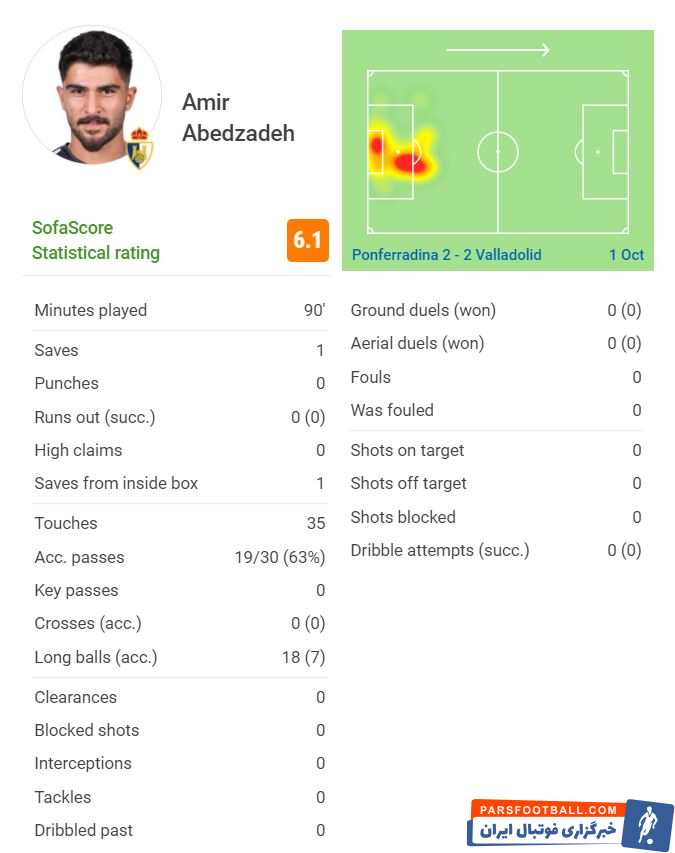 امیرعابدزاده در هفته پنجم رقابت های لیگ دسته اول فوتبال اسپانیا موفق به کلین شیت شد