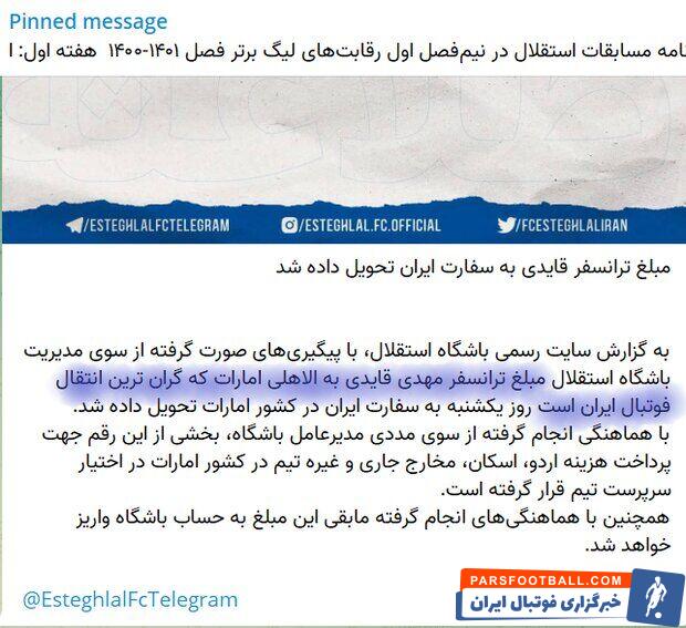 تصویری از خبر رسانه استقلال که در آن تاکید شده «ترانسفر قایدی به الاهلی گرانترین انتقال فوتبال ایران است