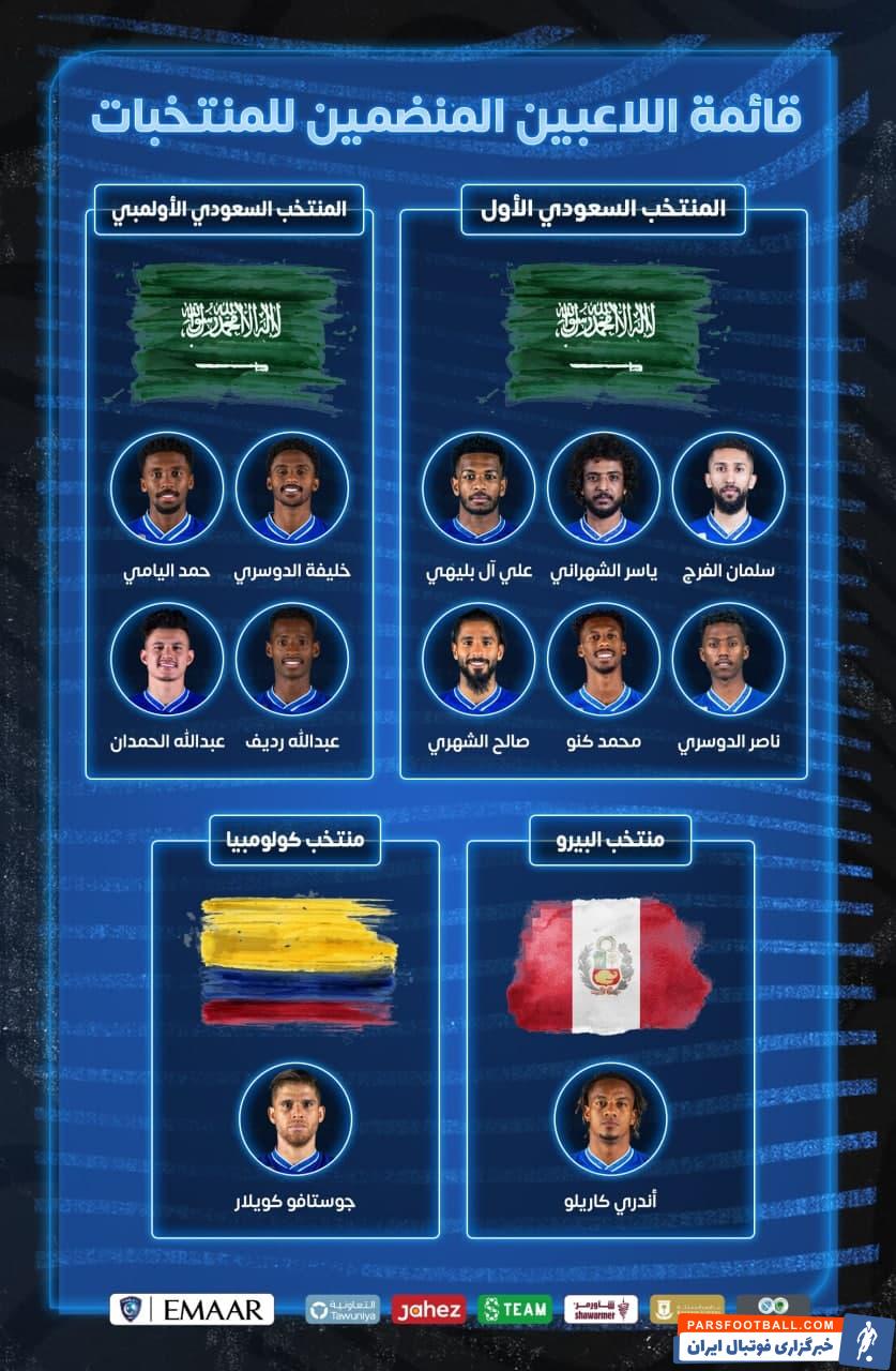 تیم الهلال با حضور شش ملی پوش در تیم ملی بزرگسالان عربستان، ۴ ملی پوش در تیم المپیک و دو ملی پوش در کلمبیا و پرو به استقبال فیفادی میرود.