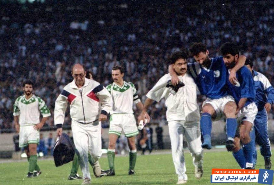 در تصویر مجید نامجومطلق را می بینیم که با کمک شاهرخ بیانی و دکتر شهرآبادی پزشک تیم استقلال به بیرون زمین منتقل می شود.