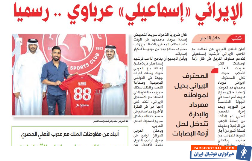 مصدومیت مهرداد محمدی مهاجم ایرانی العربی باعث شده تا مسئولان باشگاه قطری بلافاصله جانشینی را برای مهاجم ایرانی خود پیدا کنند که در نهایت با فرشید اسماعیلی هافبک سابق استقلال به توافق رسیدند.