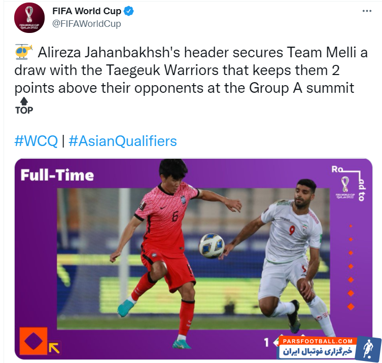 صفحه مسابقات جام جهانی فوتبال (فیفا) درباره تساوی تیم ملی فوتبال ایران مقابل کره جنوبی نوشت: ضربه سر علیرضا جهانبخش، تساوی تیم ملی ایران را مقابل جنگجویان تائگوک تضمین کرد تا این تیم با دو امتیاز بیشتر از کره جنوبی، در صدر جدول گروه A قرار بگیرد.