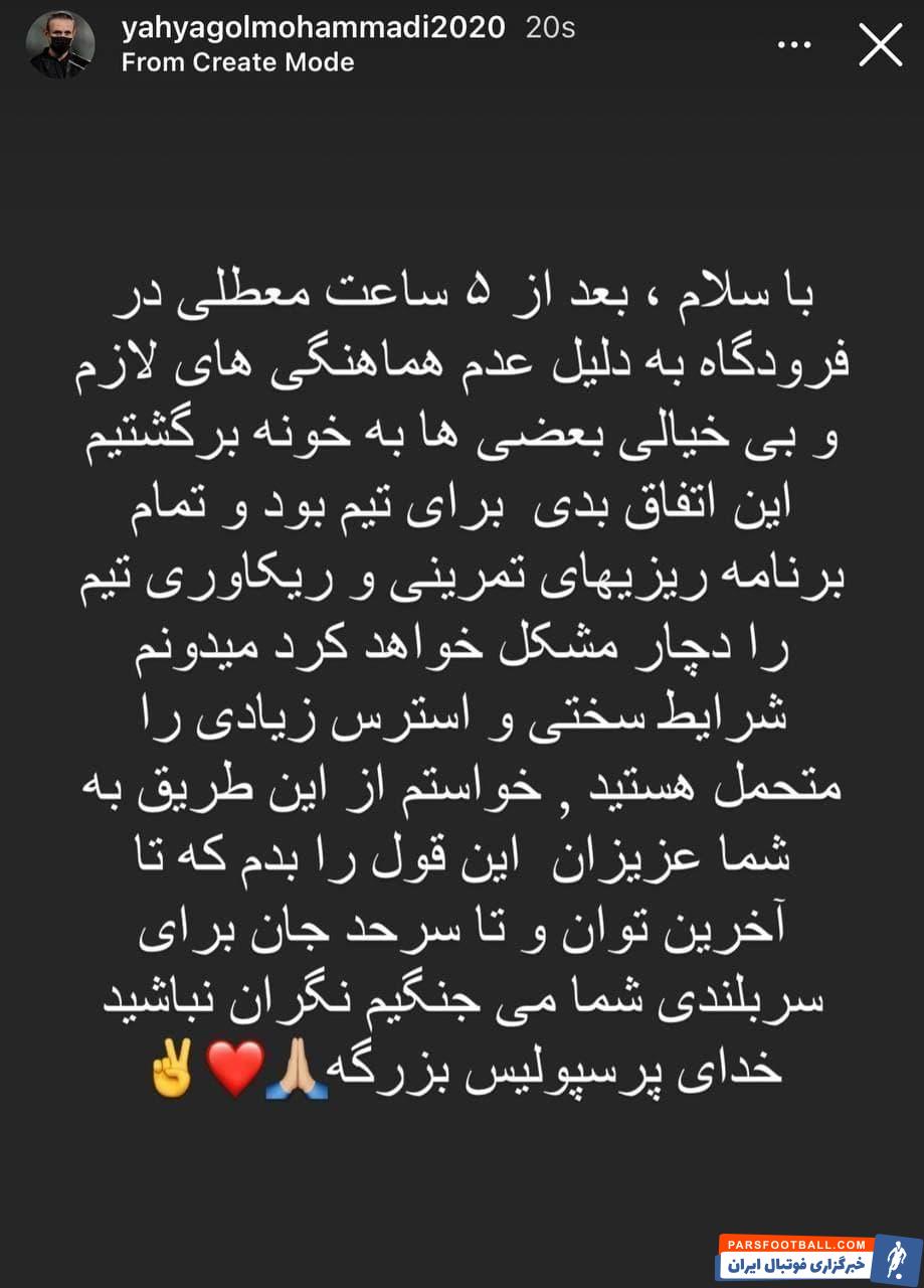 با سلام، بعد از پنج ساعت معطلی در فرودگاه به دلیل عدم هماهنگی های لازم و بی خیالی بعضی ها به خونه برگشتیم. این اتفاق بدی برای تیم بود و تمام برنامه ریزیهای تمرینی و ریکاوری تیم را دچار مشکل خواهد کرد. می دونم شرایط سختی و استرس زیادی را متحمل هستید، خواستم از این طریق به شما عزیزان این قول را بدم که تا آخرین توان و تا سرحد جان برای سربلندی شما می جنگیم نگران نباشید.