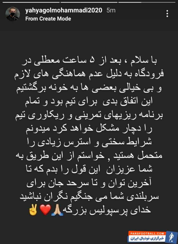 یحیی گل محمدی بعد از لغو پرواز تیم پرسپولیس به ریاض پیام مهمی برای هواداران تیمش ارسال کرد.
