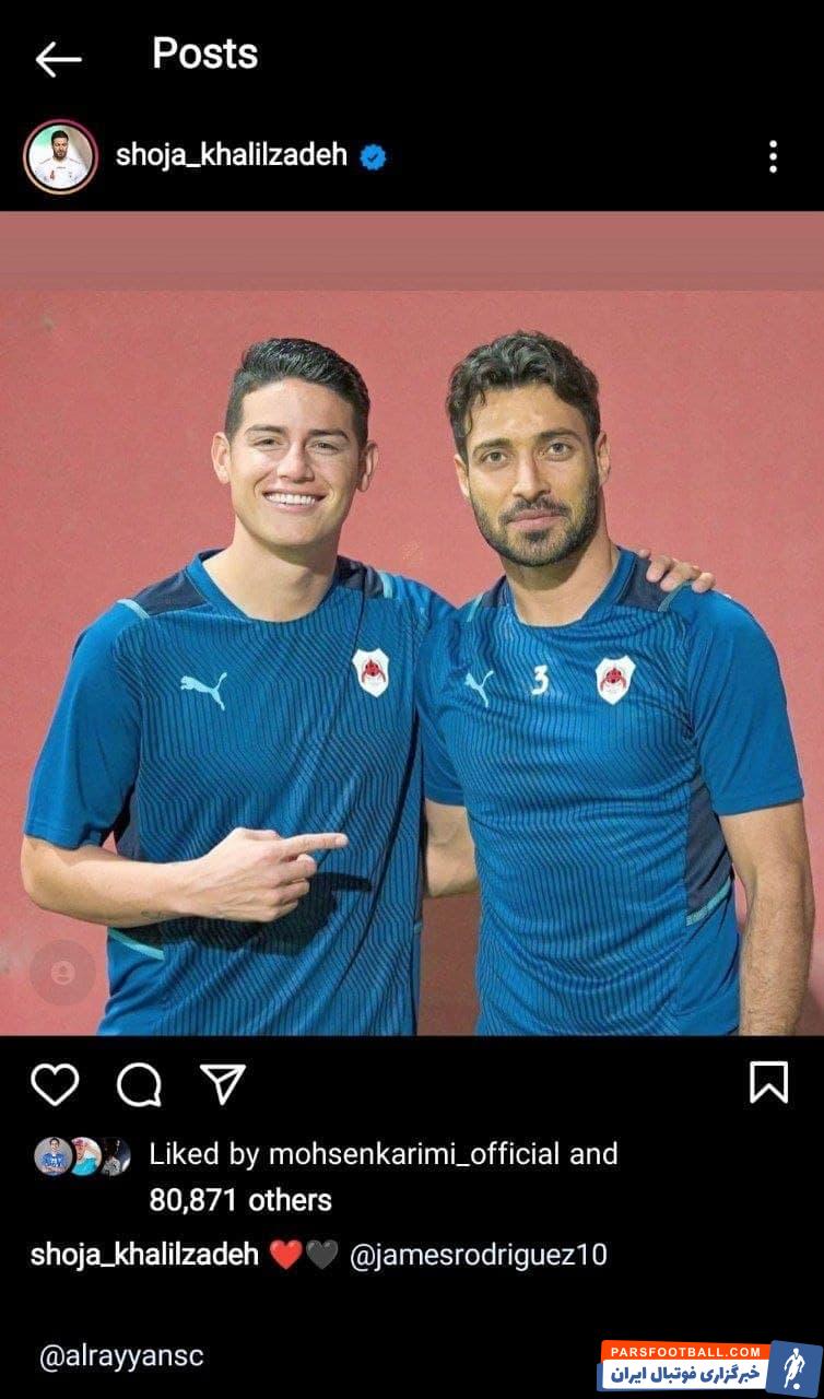 خامس رودریگز، ستاره ۳۰ ساله کلمبیایی پیشین رئال مادرید ، بایرن مونیخ و آقای گل جام جهانی ۲۰۱۴ برزیل ، پست شجاع خلیل زاده را با پرچم ایران استوری کرد.
