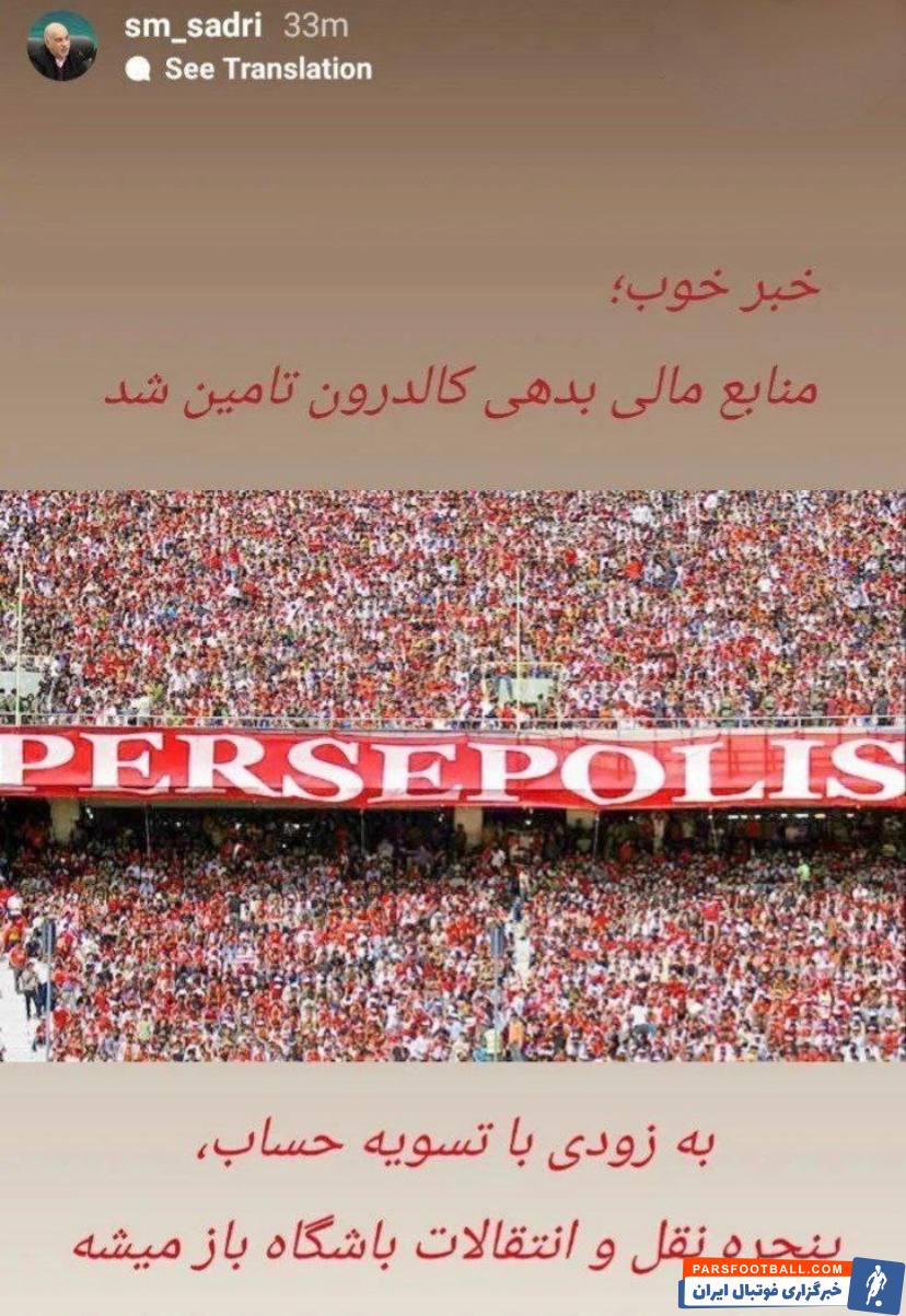 اکنون باشگاه پرسپولیس و مجید صدری خبر از تامین منابع مالی لازم برای پرداخت مطالبات گابریل کالدرون داده است. سرپرست باشگاه پرسپولیس در پیامی که در صفحه اینستاگرامی خود با اعلام “خبر خوب” قرار داده است از تامین منابع مالی برای پرداخت بدهی گابریل کالدرون خبر داده است و در تکمیل این خبر خود آورده که به زودی با پرداخت این بدهی، پنجره پرسپولیس باز خواهد شد.