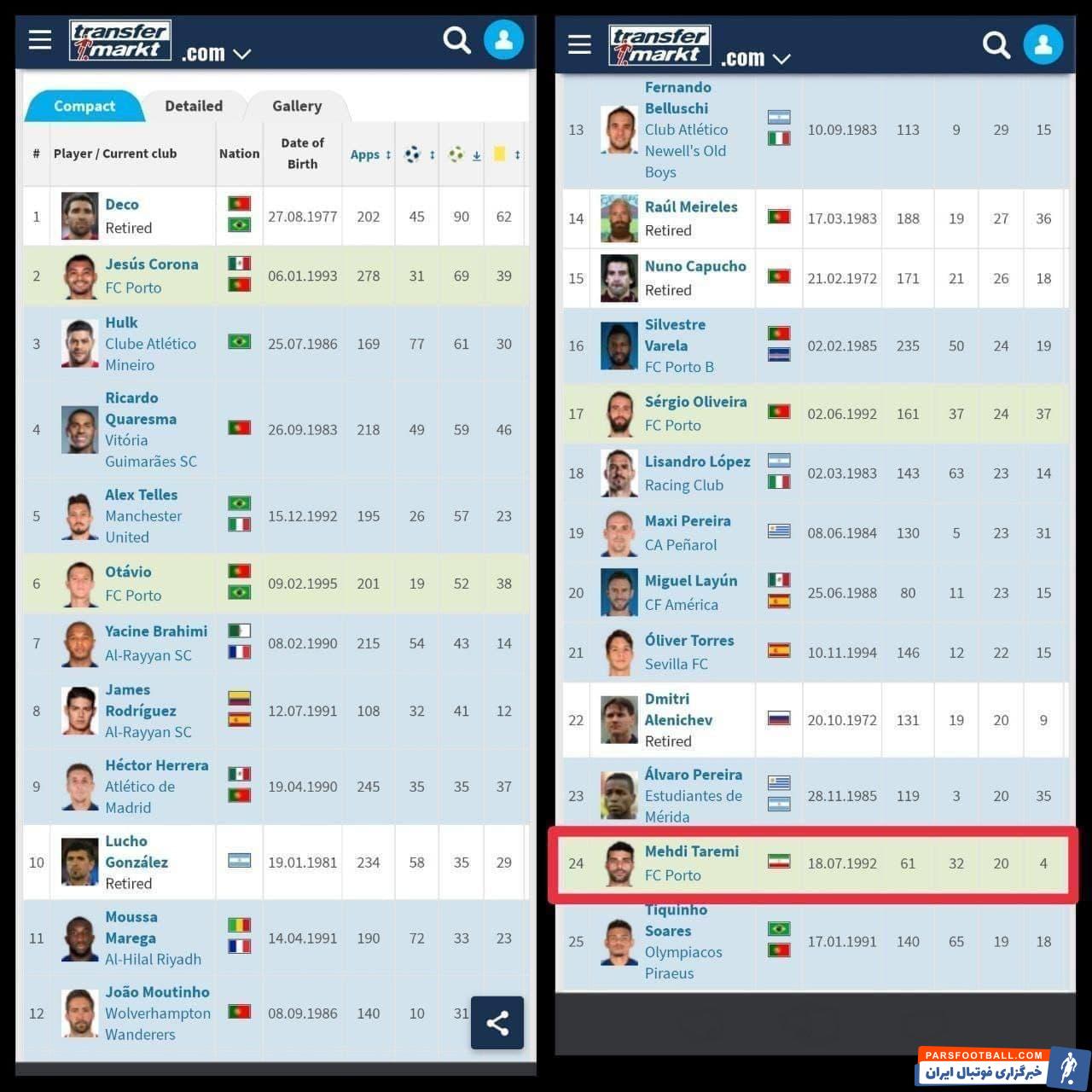 مهدی طارمی در حال حاضر با ۲۰ پاس گل در ۶۱ بازی در رده بیستم بهترین پاسورهای تاریخ باشگاه پورتو قرار گرفته است و این درحالی است که او نسبت به تعداد بازیهایی که انجام داده عملکرد فوقالعادهای ثبت کرده است. مهاجم ایرانی پورتو علاوه بر ارسال ۲۰ پاس گل توانسته ۳۲ گل نیز به ثمر برساند.