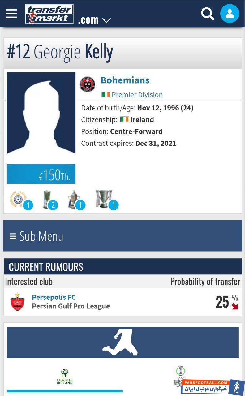 جورج کلی بیست و چهار ساله، بازیکن تیم بوهمیان ایرلند مهاجم نوک با قیمت صد و شصت و پنج هزار یورو در ترانسفرمارکت به پرسپولیس لینک شده است.