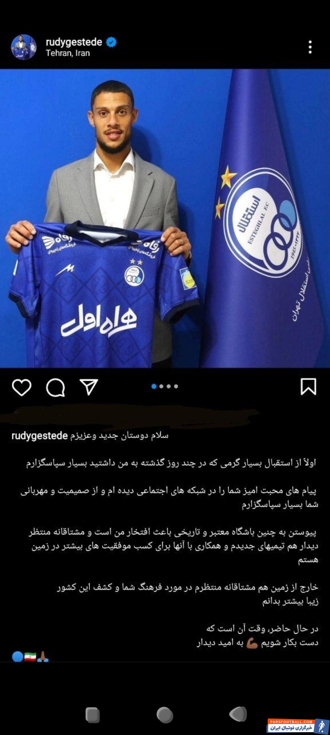 عکس ؛ پست اینستاگرامی رودی ژستد پس‌ از پیوستن به استقلال : پیوستن به چنین باشگاه معتبر و تاریخی باعث افتخار من است