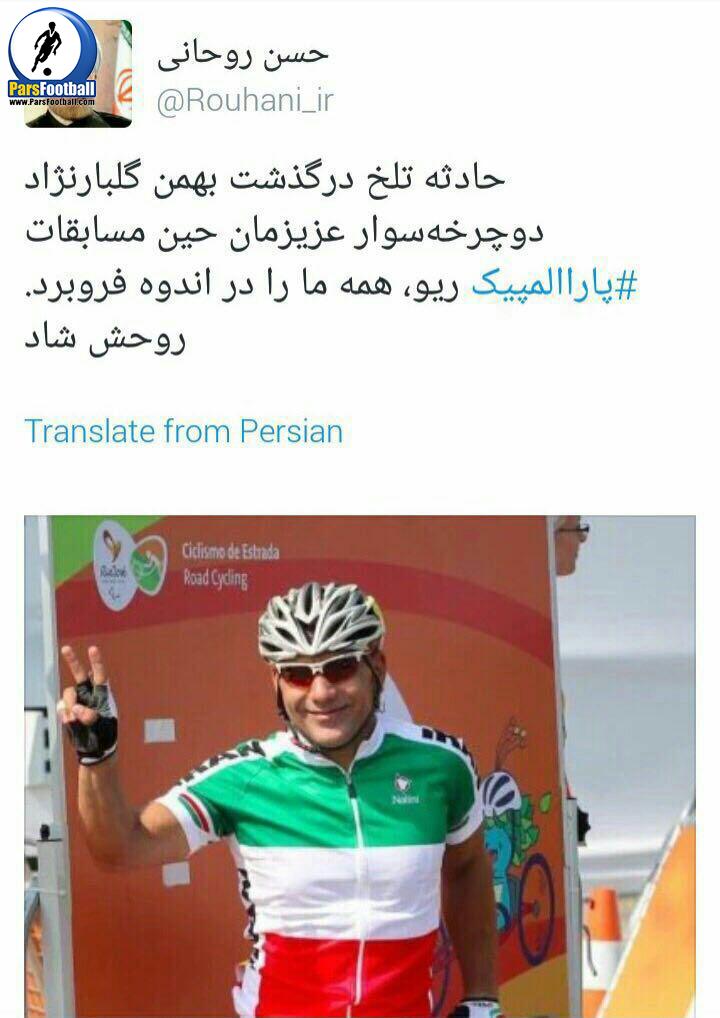 پیام آقای رییس جمهور: حادثه تلخ درگذشت بهمن گلبارنژاد دوچرخه سوار عزیزمان حین مسابقات پارالمپیک ریو، همه ما را در اندوه فرو برد. روحش شاد