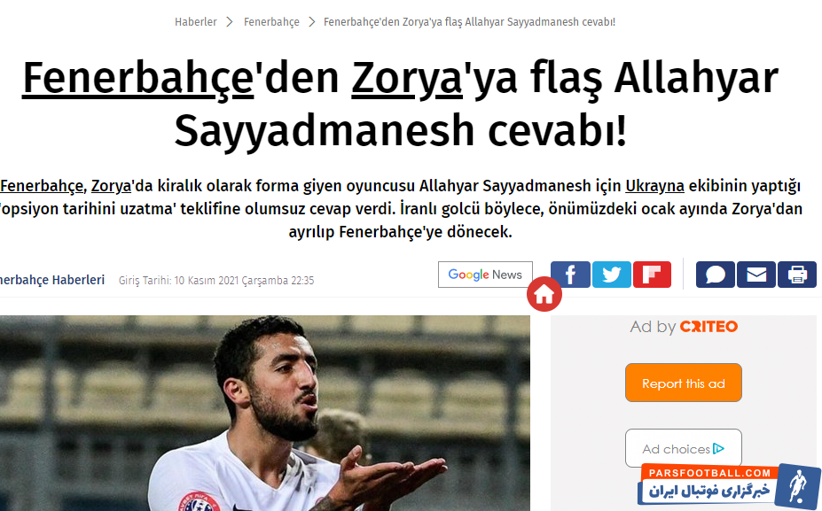 سایت fotomac ترکیه مدعی شد : اللهیار صیادمنش مهاجم زوریا اکراین در نقل و انتقالات زمستانی این فصل باید به فنرباغچه بازگردد