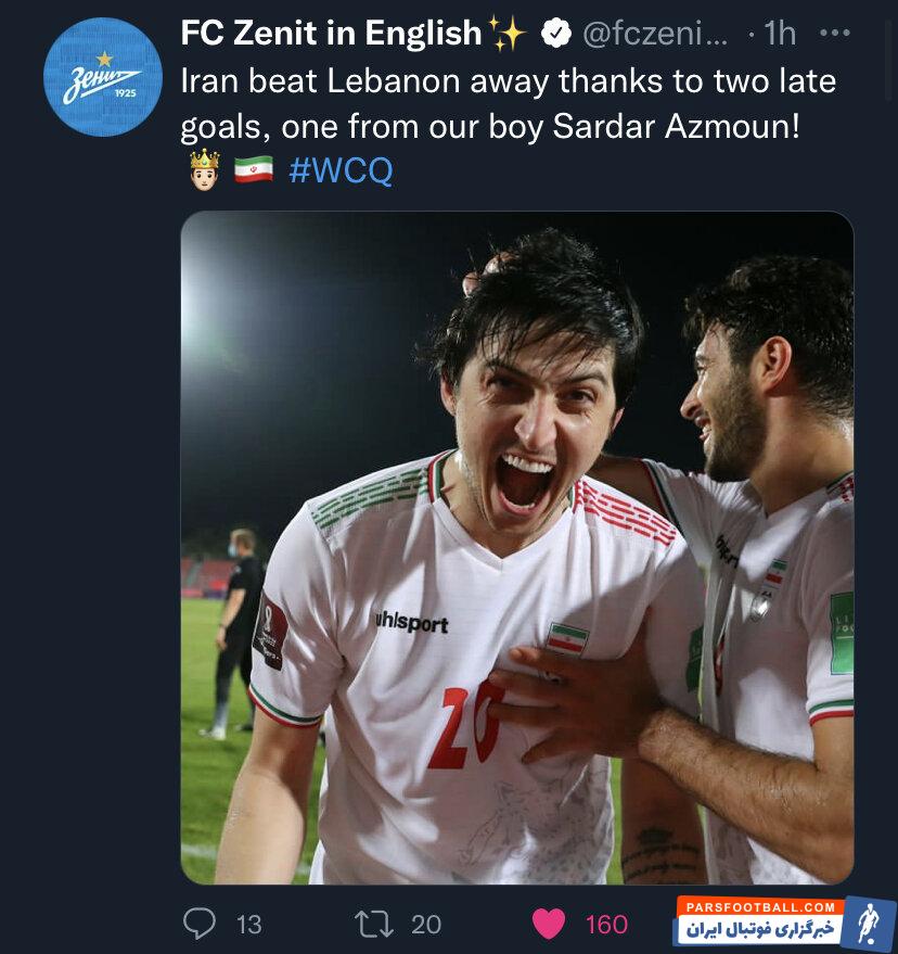 عکس ؛ واکنش باشگاه زنیت سن پترزبورگ به گلزنی سردار آزمون در بازی ایران - لبنان